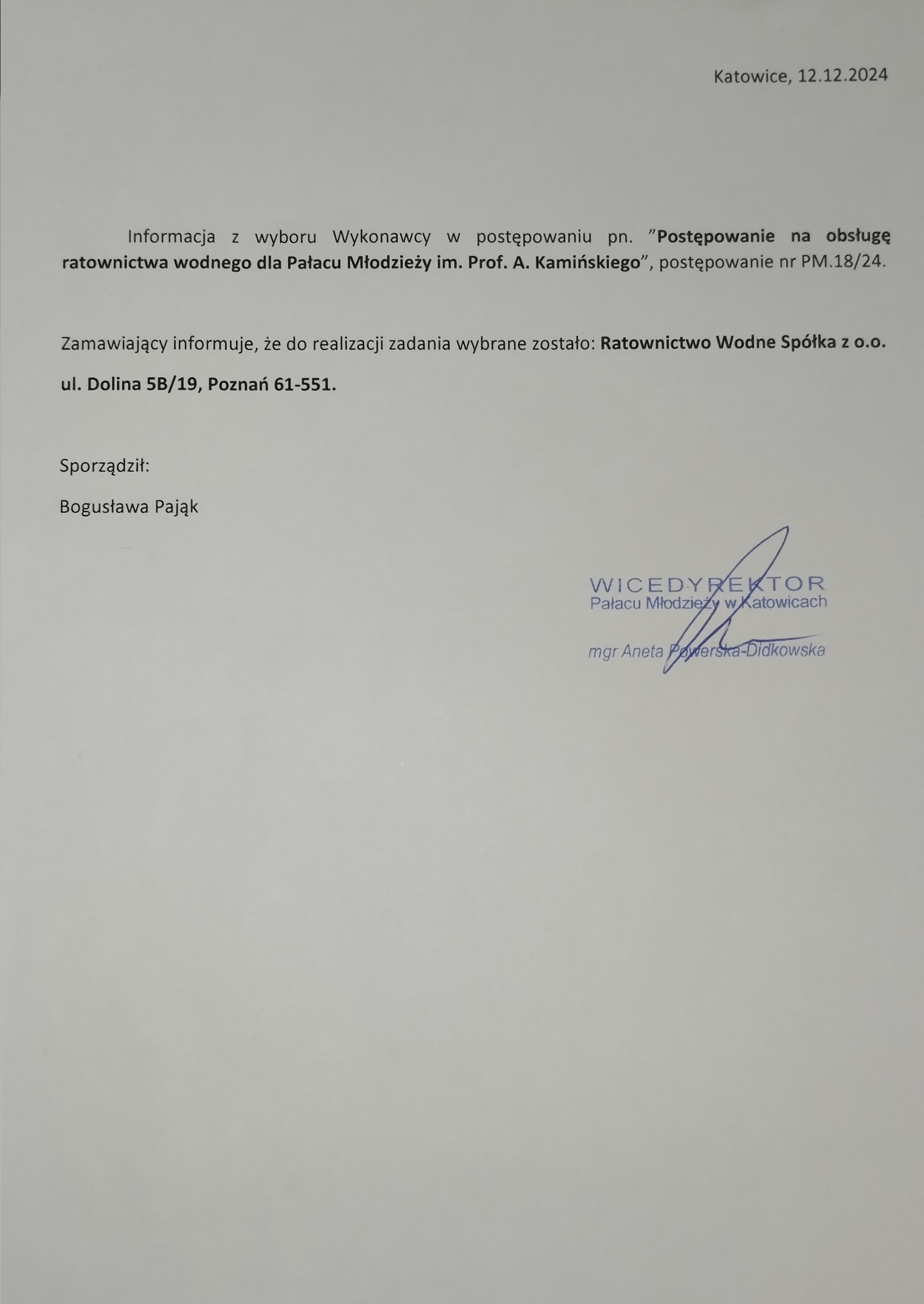 PM.18/24 - Postępowanie na obsługę ratownictwa wodnego dla Pałacu Młodzieży im. prof. A. Kamińskiego
